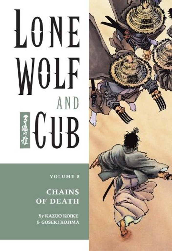 Volume 8 - 1st printing. "Chains of Death!" Written by Kazuo Koike. Art by Goseki Kojima. Cover by Frank Miller and Lynn Varley. The journey of vengeance in blood and honor continues. Under the itinerant thumb of Yagyu Retsudo, the Shogun's secret ninja warriors, the Kurokuwa clan, attempt to ensnare Ogami. Can the Lone Wolf break the chains? If so, there are many in line behind Yagyu waiting to challenge the masterful swordsman, such as a vengeful widow, numerous police, and the freezing cold of winter itself. Plus, read the story of Ogami's rise to the position of the Shogun's Officer of Death, feel the seething root of Retsudo Yagyu's bitterness against Ogami, and watch Ogami teach a proud thief about true honor and the wages of deception. Five action-packed chapters, including never-before-translated material, are included in the latest volume of this classic series. Read it on the bullet train to Edo!