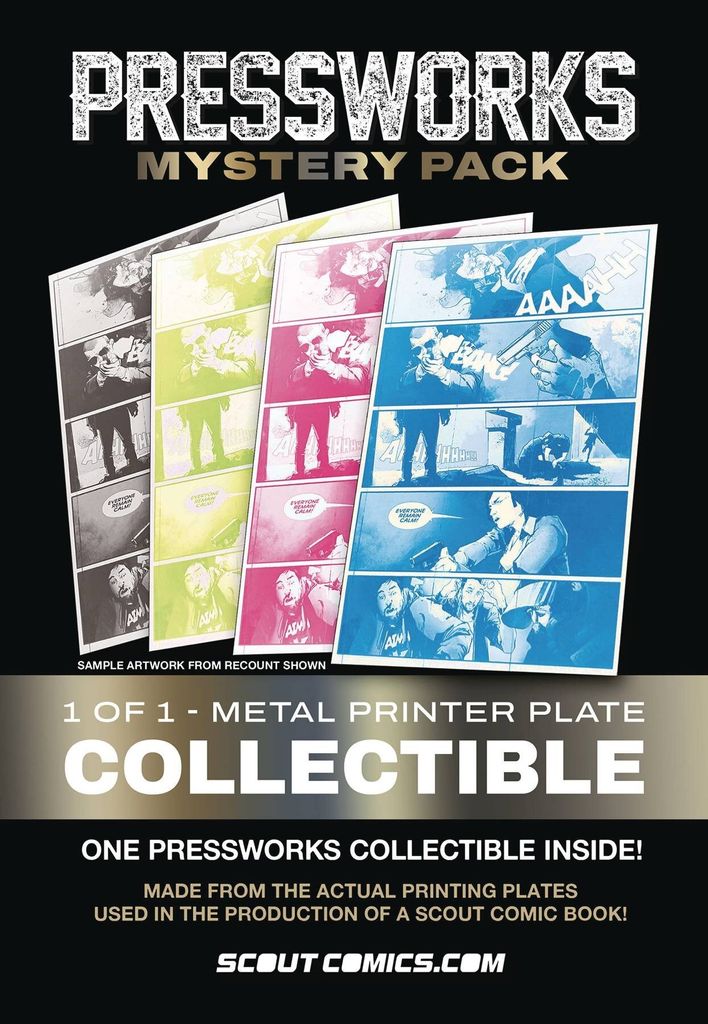 This beautiful piece of metal is from the actual printing plates used in the production of your favorite Scout comics and trade paperbacks. Each of these unique items are one-of-a-kind treasures commemorating a moment in comic book history. When the printer prints a single comic or TPB using the CMYK process, it is printed in 8 page increments using four different plates. Black, Cyan (Blue), Magenta, and Yellow. This PRESSWORK 1 of 1 printer plate collectible is sealed envelope containing of a single page plate (5' by 9') inside with a special COA sticker that has the name of the comic, the print run, the color, and AND the date printed! It also includes QR code with a downloadable PDF of that particular comic or trade paperback!