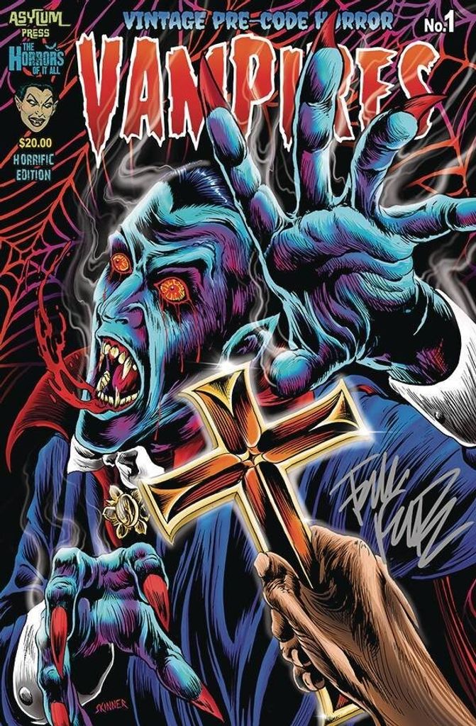 Sink your teeth into this horrifically haunted Halloween one-shot special. It's sure to drain the ever-livin' life out of you - or at least drive you batty. Editor/host Mr. Karswell (The Horrors of It All) returns with another creepy castle literally swarming with vicious pre-code Vampires! Featuring rarely seen blood sucker classics from the gory Golden Age of comics, and highlighting the spine-chilling art of Lou Cameron, Dick Beck, and George Klein. It also features vintage comic book ads and commentary by host Mr. Karswell. This Horrific Edition, with a cover by fan-fave horror artist Skinner, is signed by back cover artist/interior artist Frank Forte. Comes bagged and boarded with a Certificate of Authenticity.
