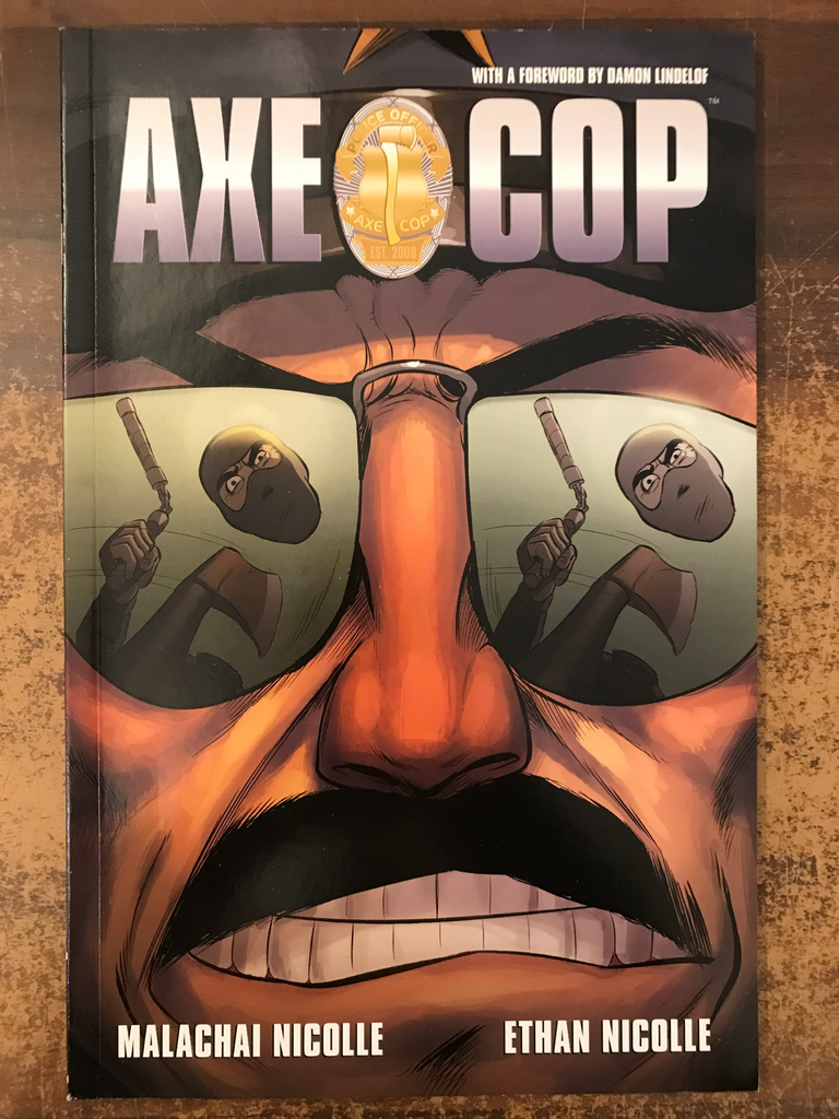 Axe Cop returns with a collection of new, exciting, and unpredictable stories! Written by the endlessly inventive six-year-old Malachai Nicolle and drawn by his Eisner Award-nominated thirty-year-old brother Ethan Nicolle, Axe Cop joins his comrades Uni-baby, Bat Warthog Man, and Dinosaur Soldier to fight bad guys and restore justice for kids- and grownups-everywhere!