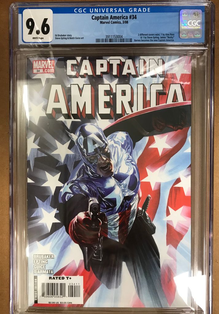 CAPTAIN AMERICA #34 PUBLISHER: Marvel Comics YEAR: 2008 CGC GRADE: 9,6 2 different covers exist 1 by Alex Ross & 1 by Steve Epting. James "Bucky" Barnes becomes the new Captain America.