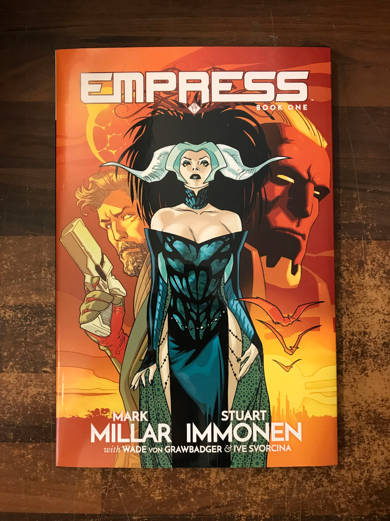 Imagine you're married to the worst bad guy from your favorite sci-fi movie, an alien dictator feared throughout the universe, who will kill you if you leave - but you need to escape for the sake of your three children. That's the life of Queen Emporia. All she has are her wits, her bodyguard, and three guns to get her kids across the galaxy - and her husband Morax's forces are in hot pursuit. Easy, right? Their desperate race for their lives will take them through interplanetary war zones, across dead worlds and into the path of monstrous beasts! Danger piles upon danger when slavers circle, and a tribal priestess thirsts for a blood sacrifice! All the while, Morax executes anyone and everyone in his way. Welcome to EMPRESS, your new favorite comic! Collecting EMPRESS #1-7. Rated T+