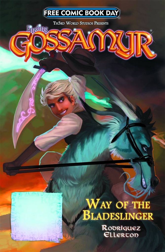 Return to the fantastic world of Finding Gossamyr as Th3rd World's critically acclaimed series continues in a brand new Free Comic Book Day adventure that leads into the upcoming Volume 2! Eloric helped Jenna and her brother Denny save an entire city from the evil of the Skaythe and has been celebrated as one of the heroes of Gossamyr. But there are events in his past that will return to haunt him and challenge this young farmer's ambition to become a true Bladeslinger of Gossamyr! Also featured in this issue, a preview of a brand new Th3rd World Studios series, 'Past the Last Mountain', where humanity has won an epic war against creatures of fantasy and locked them all away in penal colonies. But a young troll, dragon and faun challenge the authority of their human captors and escape in search of the fabled sanctuary known only as 'Dragon Lake'.