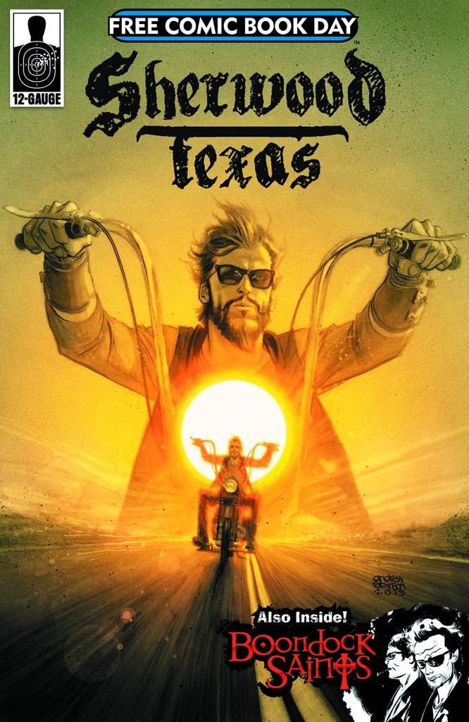 A story older than all of us, told now for the first time… After the same biker gang who murdered his father leaves ROB HOOD for dead, he returns to seek revenge on an epic, blood-soaked scale. Combining the biker gang epic with Spaghetti Western sensibilities, SHERWOOD, TX retells the legend of Robin Hood as a modern day, noir-action opus. Hood is joined on his quest by Padre Elvin Tuck, Will Scarlet, and Little John, as they take on the crooked Sheriff of Nottingham, TX and his partners in crime, The Nobles biker gang and their leader John Prince. Included in this 12-Gauge FCBD issue is a special BOONDOCK SAINTS co-feature, written by film-franchise creator/writer/director Troy Duffy and comic scribe J.B. Love, with art by Toby Cypress! Fans of the film series won't want to miss this short story/deleted scene from the original cult-classic film, as the MacManus brothers bring their brand of justice to the criminals of Boston, MA.