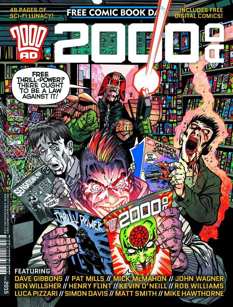 The galaxy's greatest Eisner-nominated SF anthology returns to Free Comic Book Day with a 48 page zarjaz line-up of stories. In Through the Out Door, a brand new story from Matt Smith and Norm Breyfogle, Judge Dredd uses the iron fist of the law to settle a block dispute; in 3000 AD some jobs are murder, as proved by The Traveller from Mick McMahon; galactic frontiersman Ajax Bloodthirsty meets his match on the astronomical object of oblivion known as the Death Rock in a new tale from Ben Willsher and Barry Krishna; the Grand Master of Termight is sickened to find that his final resting place has been defiled by the legendary alien freedom fighter, Nemesis the Warlock in Tomb of Torquemada by Pat Mills and Kevin O'Neill; wizened master of the occult, Doctor Sin returns to pass on his mantle (and battle a demon) in Don't Call It A Comeback by Rob Williams and Luca Pizzari; pilot of the future, Dan Dare, discovers an alien satellite in Star Slayer by Dave Gibbons and Gerry-Finley Day; Celtic warrior Sláine acquaints more enemies with his axe in A Simple Killing by Pat Mills and Simon Davis; Judge Dredd upholds the law in some classic Dredd newspaper strips by John Wagner, Alan Grant and Ron Smith; and Prepare your mind to be melted by Tharg's Alien Invasions from supreme craz-o-naut Henry Flint. If this wasn't enough each strip comes with a FREE digital story attached!