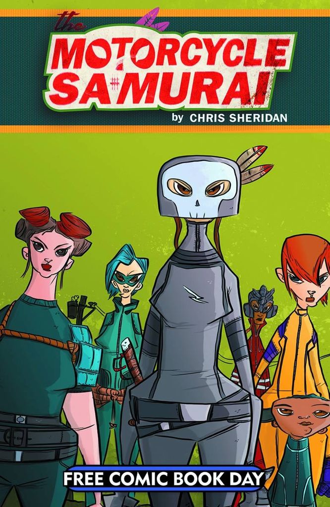 Look hard into the storm clouds. You may yet see her, mounted on her electric steed, streaking past. The last hero of the West. THE MOTORCYCLE SAMURAI! It's been called 'the new benchmark for indie digital comics.' Now discover the mad genius of THE MOTORCYCLE SAMURAI for yourself, as Chris Sheridan does the unthinkable: brings his creation to print! Top Shelf celebrates FREE COMIC BOOK DAY with 24 pages of full-color action, whetting appetites around the world for the future release of the MOTORCYCLE SAMURAI graphic novel. Now saddle up and let's ride!