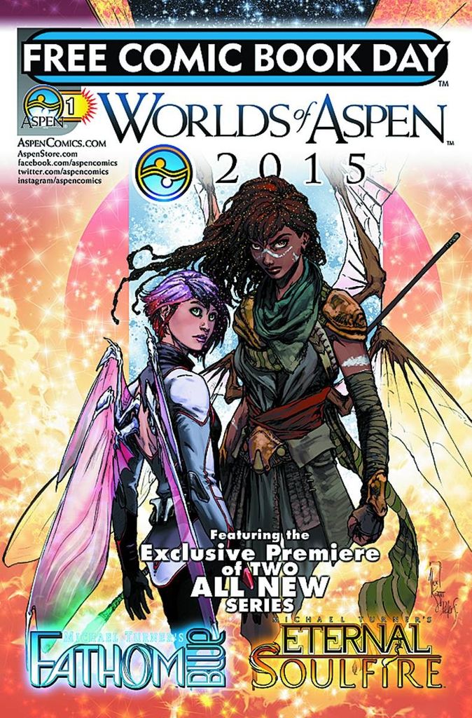 Two all-new FATHOM and SOULFIRE series begin right here! Aspen's flagship universes grow larger with two original series debuting exclusively in this year's Free Comic Book Day flipbook offering! MICHAEL TURNER'S FATHOM: BLUE features a brand new cast of Blue outlaws from under the surface, coerced together by the U.S. Government for a covert war against their own kind-but if they fail their mission-their lives are over! Meanwhile, in MICHAEL TURNER'S ETERNAL SOULFIRE, a new wielder of magic emerges! Cassidy, a young girl with a huge power hidden within her, must place her trust in one of the Soulfire Universes' most fierce warriors, Miya, in order to escape not only those seeking to kill them-but also their own demons from the past! Make sure to stop by your local comic book store and pick up these two exclusive zero issue offerings only in this year's Worlds of Aspen 2015!
