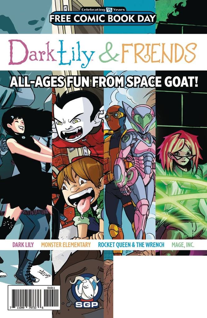 Fun for all ages from Space Goat Publishing for Free Comic Book Day! This title features the first appearance of Dark Lily, a character destined for her own title in 2016. Meet the fun loving characters of Monster Elementary as they make their direct-market debut (coming to comic stores in 2016). The Monster Elementary graphic novel won the Independent Book Award's First Place Gold Medal for 'Best Humor Graphic Novel'. Plus, young readers get a free glimpse at both Rocket Queen & The Wrench and Mage, Inc., already in stores.