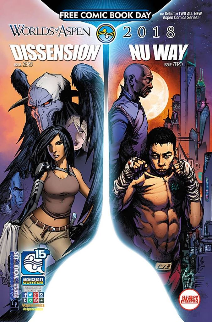 Celebrate 15 years of publishing with Aspen Comics in this jam-packed Worlds of Aspen Free Comic Book Day 2018 Anniversary Edition! As Fathom, Soulfire and Executive Assistant: Iris all commemorate milestones, TWO brand-new Aspen series make their world premiere debut with exclusive zero issues! Veteran Aspen writer J.T. Krul (Jirni, Mindfield) and acclaimed artist Alex Konat (Michael Turner's Fathom) present Nu Way, an all-new action-adventure series set in 2051, where technology has infected every aspect of human life, and the last frontier may be our very souls as people sacrifice their flesh and blood for a chance at a better life. In New Sheng, the megatropolis in China that has become the center of the world, a young combatant named Zihao is trying to literally fight his way up from the city slums with his fists, hoping to make it to the big leagues where cybernetically-enhanced warriors battle for fame and fortune. For the second exciting half of this Aspen Anniversary Edition, popular Aspen creator Jordan Gunderson (No World, The Four Points) debuts his long-awaited first creator-owned series, Dissension! This summer, the Gods have declared war on each other! Long ago, mankind suffered under the hand of a vengeful group of fallen angels. Now, a young woman, possessing a power that had lain dormant in the descendants of the first peoples of Earth, must rise up to stop their return-along with the war they seek to unleash on the world!