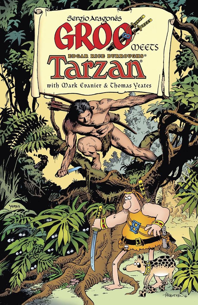 A bumbling barbarian encounters the cunning lord of the jungle, but will Groo wind up destroying the jungle itself or teaming up with Tarzan to fight slavers? With cartoonist Sergio lost and running from hungry lions in Chula Vista's Jungle Safari Land and script writer Mark doing panels all day at Comic-Con International, how will this comic get finished? Legendary Tarzan artist Thomas Yeates swings in to help! Plus-the legendary Rufferto backup strips from the comic series and an introduction by Mark Evanier are also included! Collects the four-issue miniseries.