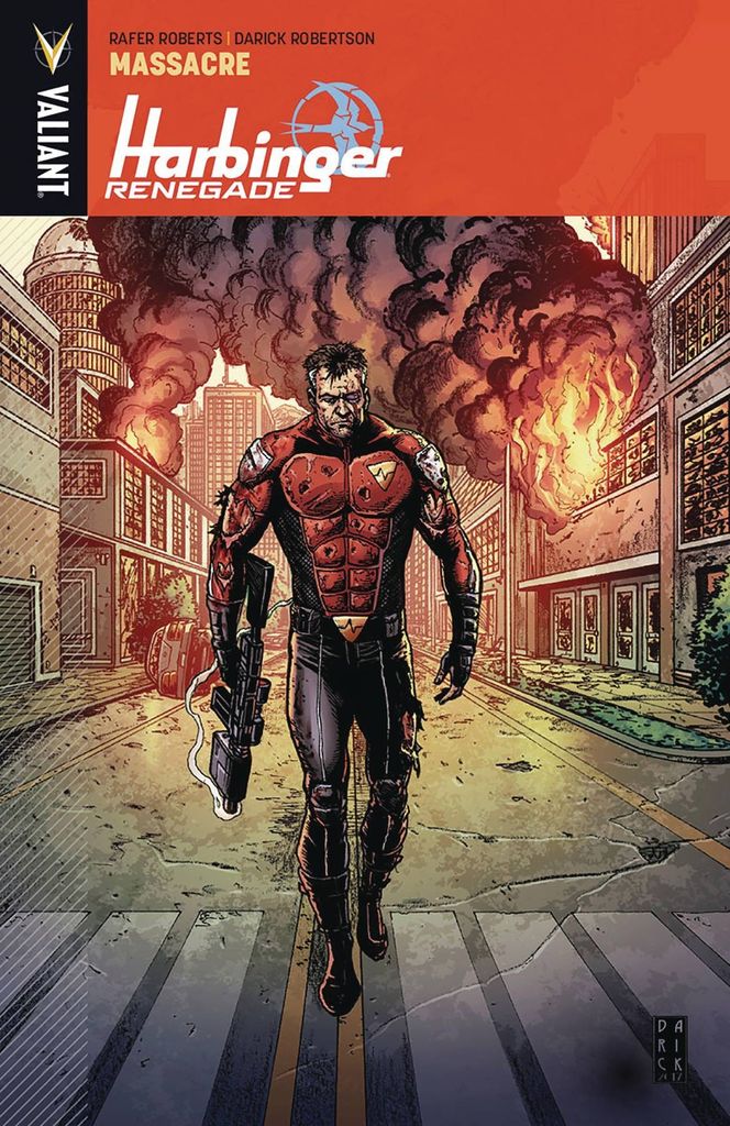 'Massacre' brings death to a major Valiant hero! Toyo Harada's former protege - Alexander Solomon, a 'psiot' with the ability to predict and analyze potential futures - has been waiting for this moment. With the Harbinger Renegades - Peter Stanchek, Faith, Kris Hathaway, and Torque - now reunited as a result of his covert manipulations, his ultimate gambit can now begin. But he's not the only one who has been watching. Major Charlie Palmer has just re-assigned a new division of the militarized psiot hunters codenamed H.A.R.D. Corps to active duty…and they're about to bring a torrent of blood and calamity roaring into the streets of a major American metropolis for an all-out Firefight. The Harbinger Renegades. Livewire. Alexander Solomon. Generation Zero. Toyo Harada. Secret Weapons. Imperium. None of them are safe…and, when the smoke clears, a pivotal Valiant hero will become the first sacrifice of the massive Harbinger War that is to come… Harvey Award-nominated writer Rafer Roberts (Plastic Farm) and superstar artist Darick Robertson (The Boys, Transmetropolitan) begin THE ROAD TO HARBINGER WARS 2 - right here with a bang that will reverberate throughout the entire Valiant Universe…and claim the life of a major hero! Collecting HARBINGER RENEGADE #5-#8.