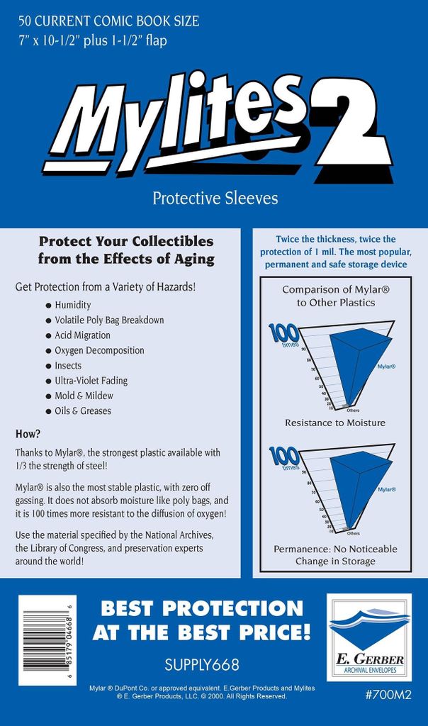 The best raw plastic material available for permanent protection and storage! At 2 mil, these are twice as thick as ordinary Mylites! They are resistant to aging, decomposition, moisture, oxygen, and gas penetration; not affected by fungus, mold, or mildew; and immune to insect and rodent attack! Sold in packs of 50.