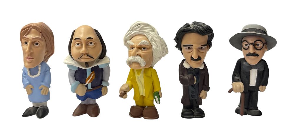 Min gissning från vänster Georgia O`keefe, William Shakespeare, Mark Twain, Edgar Alan Poe, James Joyce? Cirka 7 cm höga figurer. Begagnat, 250 kr för hela setet med 6 figurer, (O´Keefe är lite ostadig på benen:))